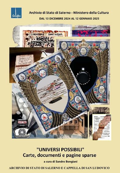 Mostra collettiva: “UNIVERSI POSSIBILI, carte, documenti e pagine sparse”, organizzata dalla Collezione Bongiani Art Museum di Salerno e costituita dalle opere di 43 artisti italiani e stranieri.